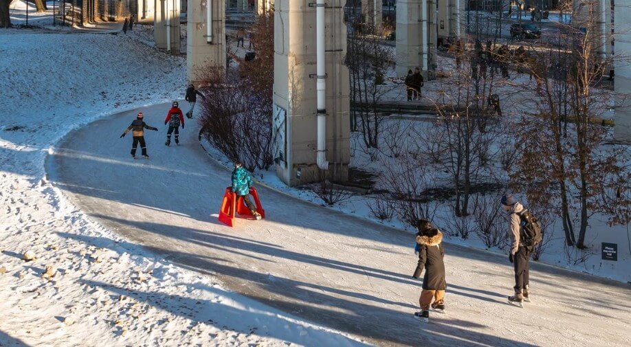 고속도로 아래, 도심 인프라를 창의적으로 활용한 특별한 스케이팅 공간입니다. 220m의 피겨-8 모양 트레일은 단순한 아이스링크와는 다른 도시적 감성을 선사합니다.